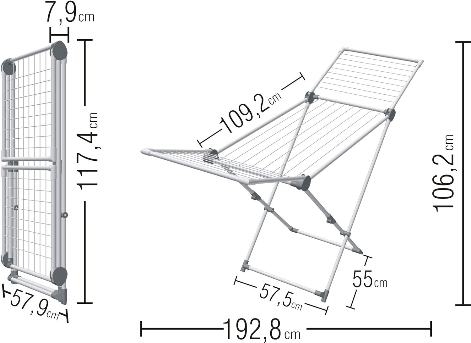 Wymiary rozłożonej suszarki: - 188,5cm x 106,5cm x 58,5cm .